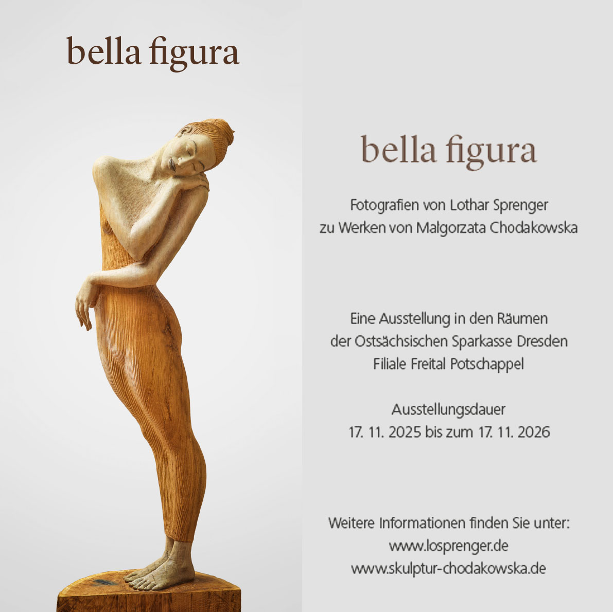 We invite you to visit our photo exhibition “Bella figura” in Freital. At the Freital-Potschappel branch of Ostsächsische Sparkasse Dresden, we are displaying 14 very large-format photographs by Lothar Sprenger. All of the sculptures, statues and fountains depicted come from my studio. The publicly accessible business premises are open for visits on Monday, Tuesday and Thursday from 9:00 a.m. to 1:00 p.m. and from 2:00 p.m. to 6:00 p.m., as well as on Wednesday and Friday from 9:00 a.m. to 1:00 p.m. The branch is located at Dresdner Straße 107 in 01705 Freital. If you are interested in purchasing individual works, we would be happy to show you these and other motifs on our website: losprenger.com, where you will also find further information.